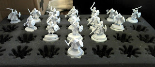 Sometimes I just need something to really keep me moving on a project. Right now I have two things to keep me working on these Normans. The first is the competition entry for ReaperCon, which must be finished by the time I leave for the convention in mid-May. The second is the converted Rohan miniatures that I finished up. They have all been primed up with white and I'm pleased that I was able to blend in the head swaps pretty seamlessly. A number of the heads are definitely a little big, but most have blended in okay, in several cases I think the new head is much better than the old. I have come to realize that a couple of these poses have heads that really are just a bit on the small side. So any way here is the carrot: